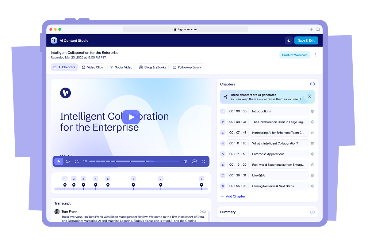 The moment your session ends, chapters appear automatically. Each chapter marks a topic shift or key moment so viewers can jump straight to what matters. You can rename chapters, adjust timestamps, or add new ones with a few clicks. The result is a polished on‑demand experience that helps audiences skim, search, and self‑serve on your site or video hub.