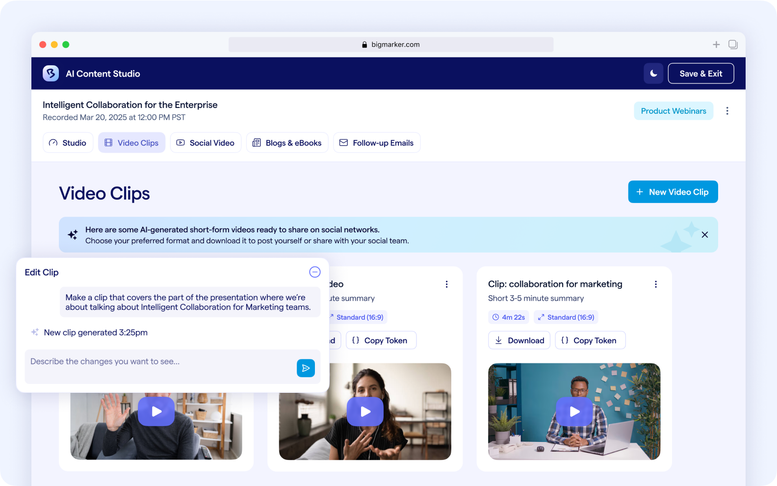 Automatically surface your best moments as reusable clips to fuel campaigns across channels and embed in webpages, nurture flows, product pages, and presentations.