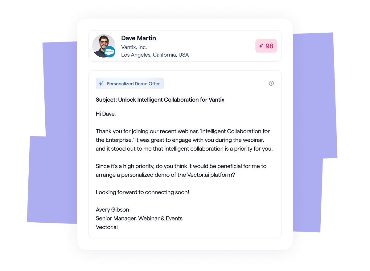 - Sales-ready lead handoff - Personalized emails warm leads using event-specific context before routing highly engaged attendees to sales